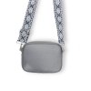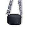 Kožená crossbody kabelka v různých barevných odstínech s vyšívaným popruhem přes rameno.